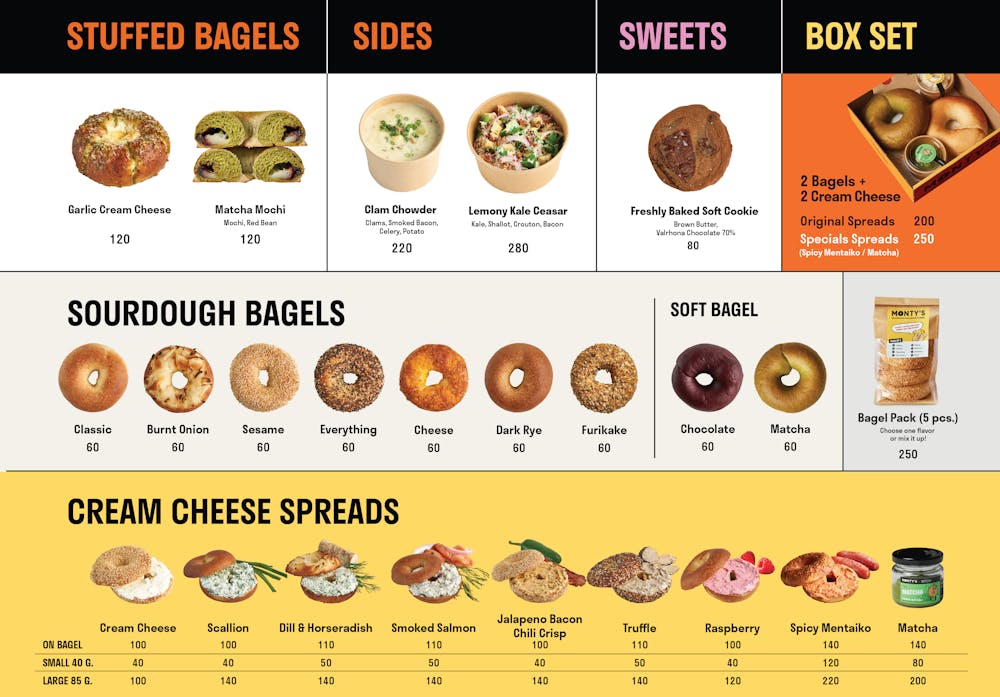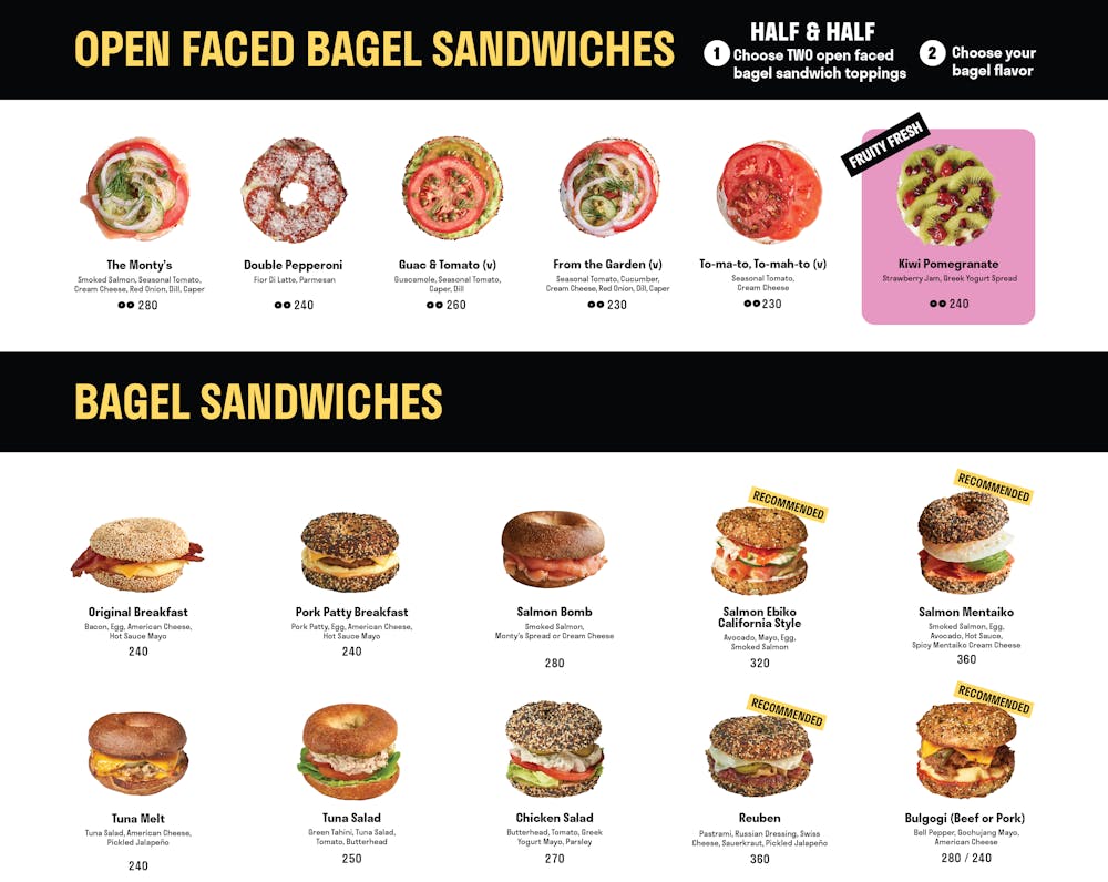 All bagels are hand-rolled and baked fresh every day with homemade toppings that are both comforting and delicious. Monty's offerings range from plain sourdough bagels with cream cheese to smoked salmon bagel sandwiches. Pair your choice of bagel with a cup of coffee, fresh juice or house lemonade and you’re ready to go!