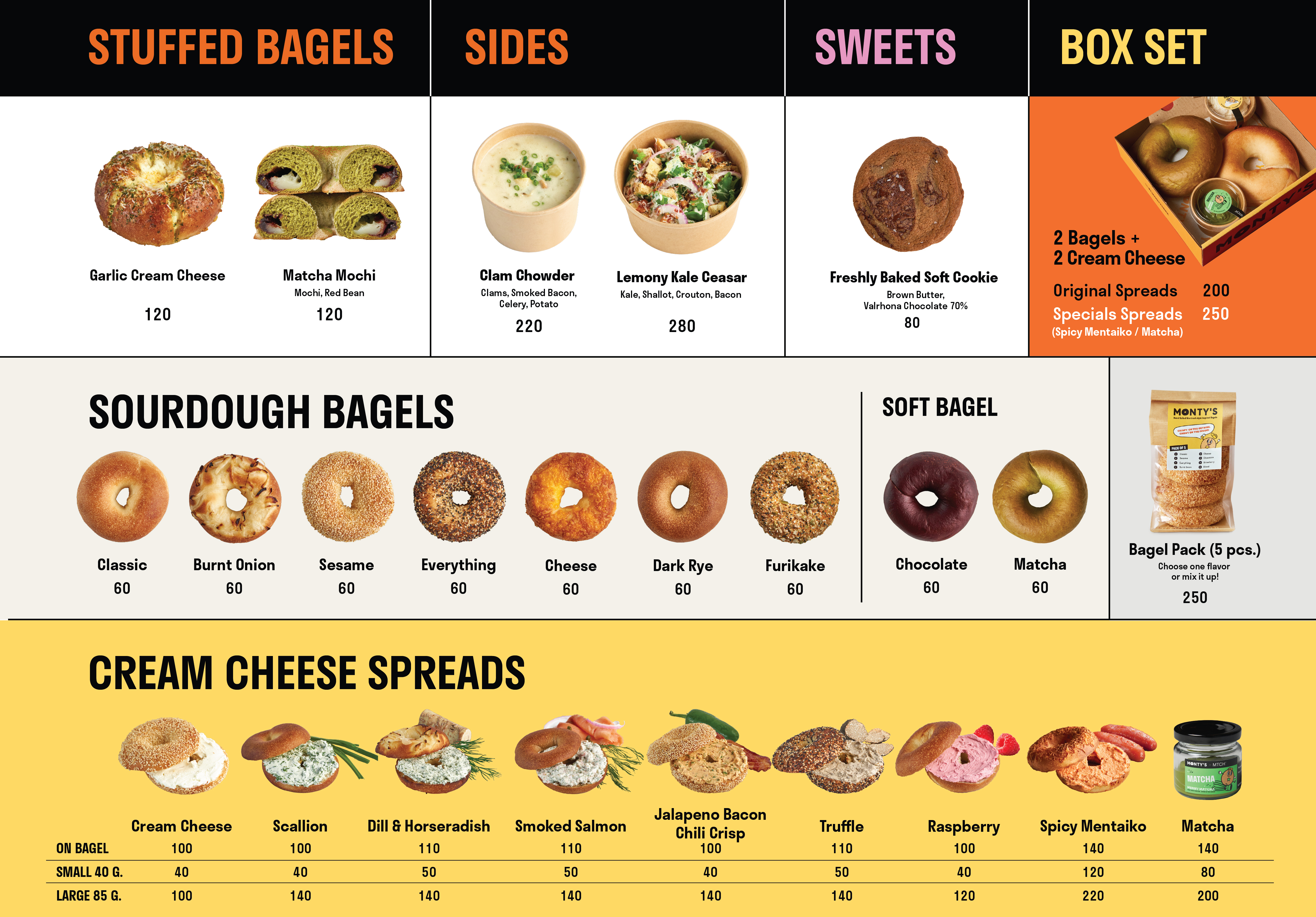 All bagels are hand-rolled and baked fresh every day with homemade toppings that are both comforting and delicious. Monty's offerings range from plain sourdough bagels with cream cheese to smoked salmon bagel sandwiches. Pair your choice of bagel with a cup of coffee, fresh juice or house lemonade and you’re ready to go!