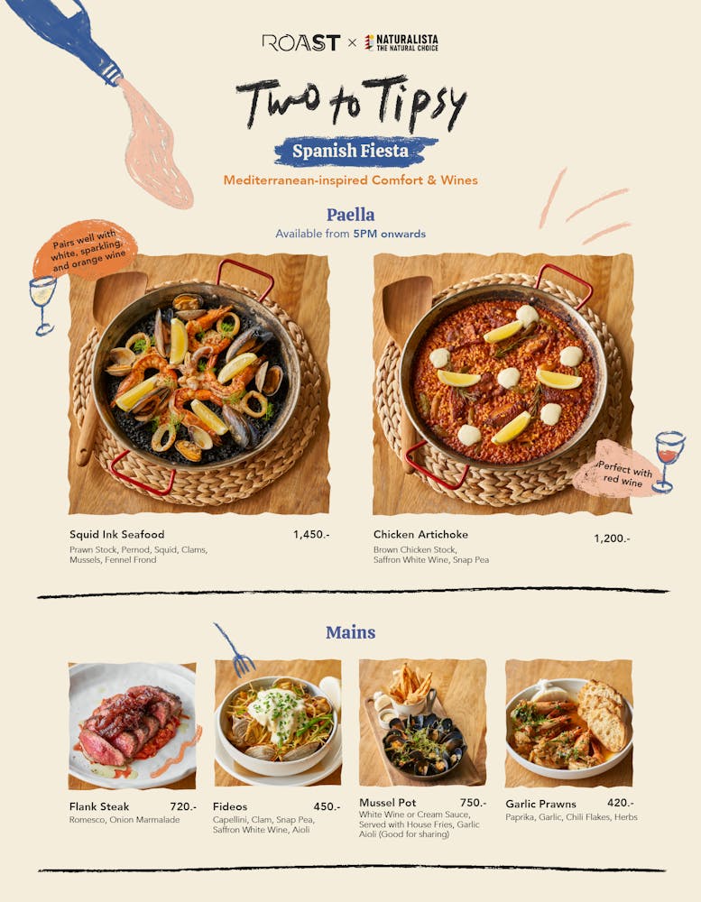 For this exciting Two to Tipsy, discover Spanish flavors with a Roast twist paired with the perfect selection of natural wines that will whisk you off to the sunny streets of Spain.